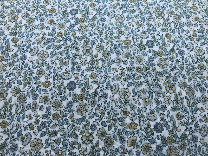 Blumen und Ranken in blau, grün und gelb auf weissem Grund, 110cm breit, Druckstoff, Baumwolle